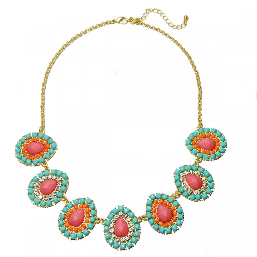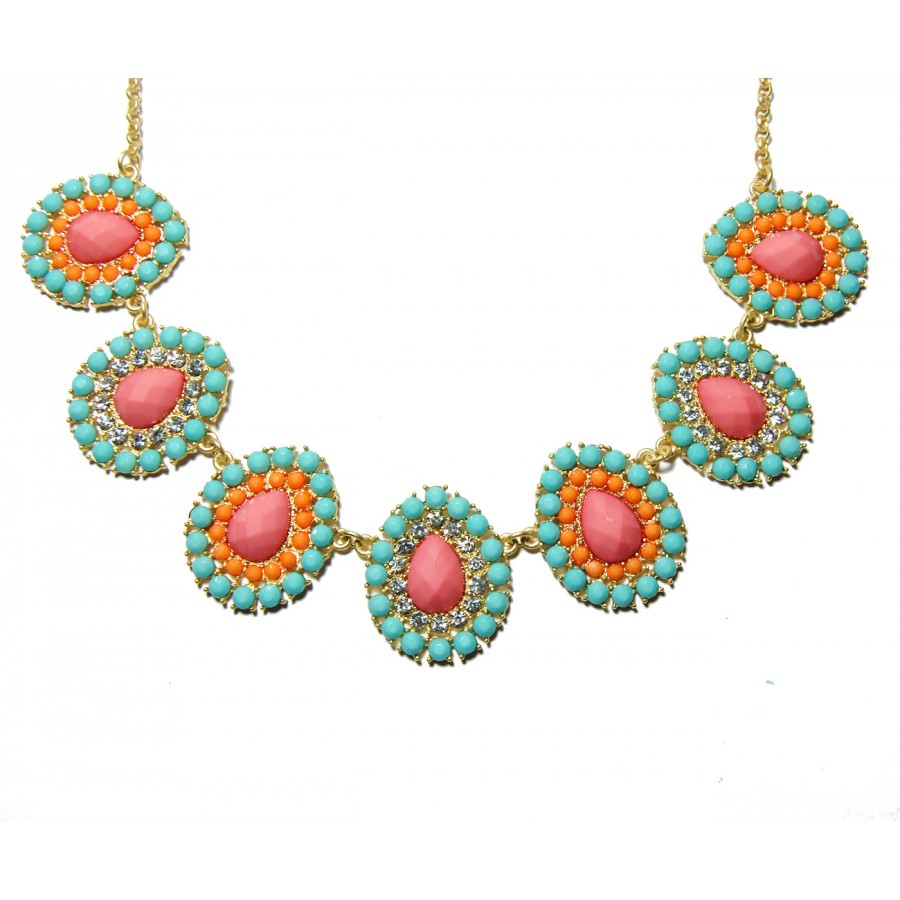 Statement necklace featuring teardrop gemstones in pretty pastels, strung along a gold tone chain.