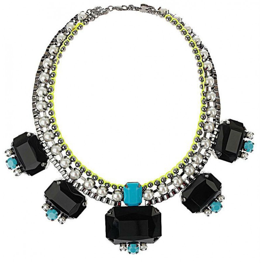 Make a statement with the grand geometric stones in dramatic black, chunky silver box chain, and weaved neon yellow threads.
