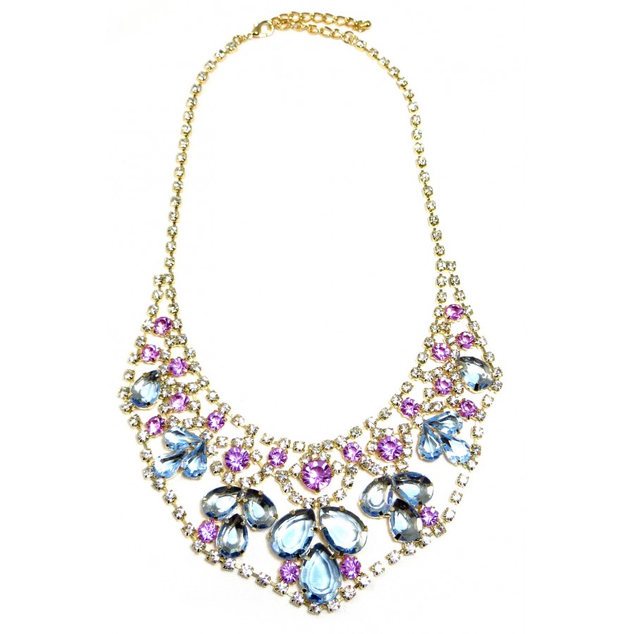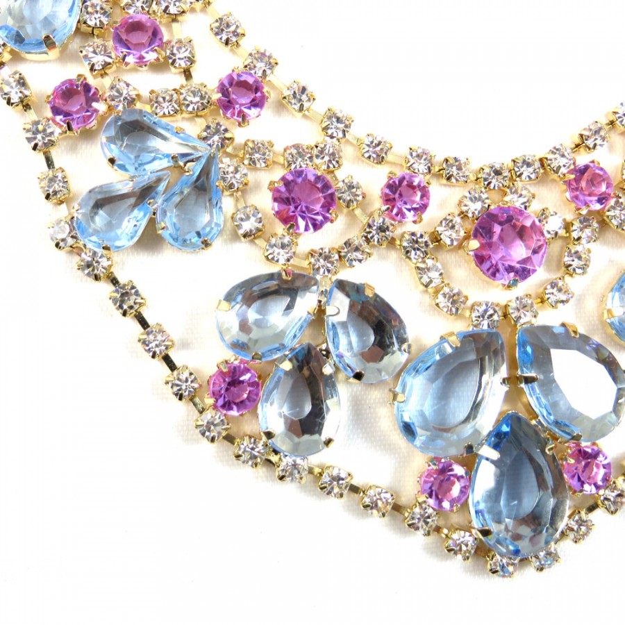 Check out this necklace's extravagant chandelier silhouette, dropping with glittering gemstones of beautiful teardrop crystals in lavender and pastel blue.
