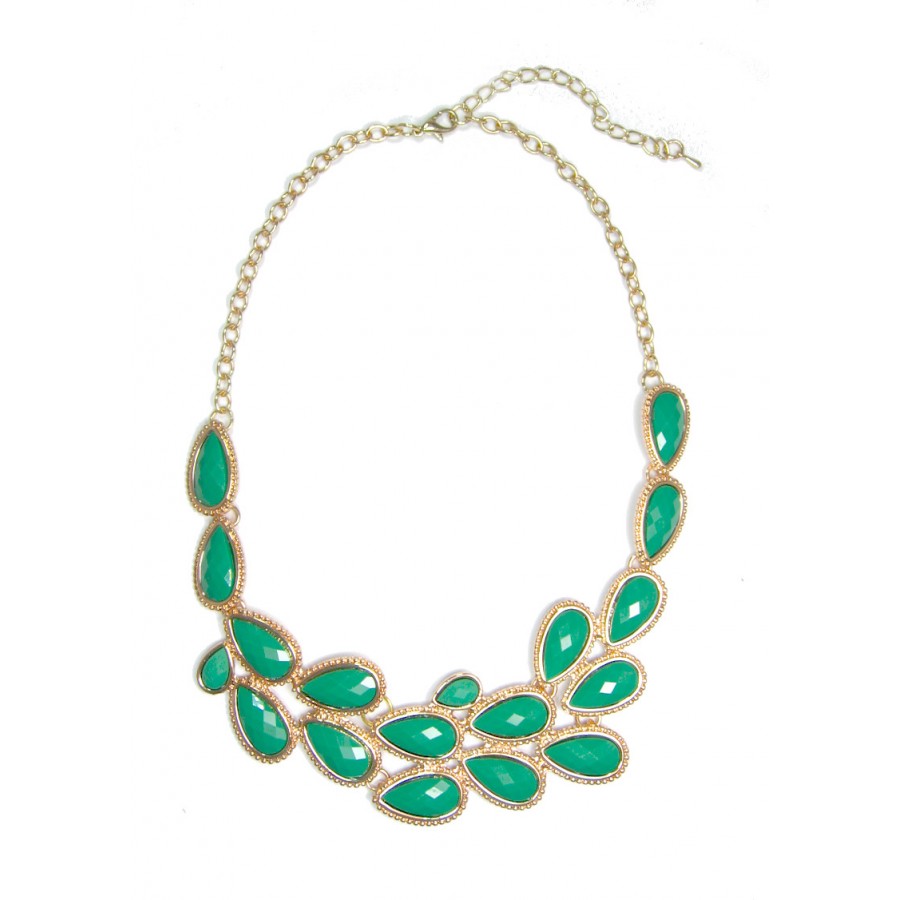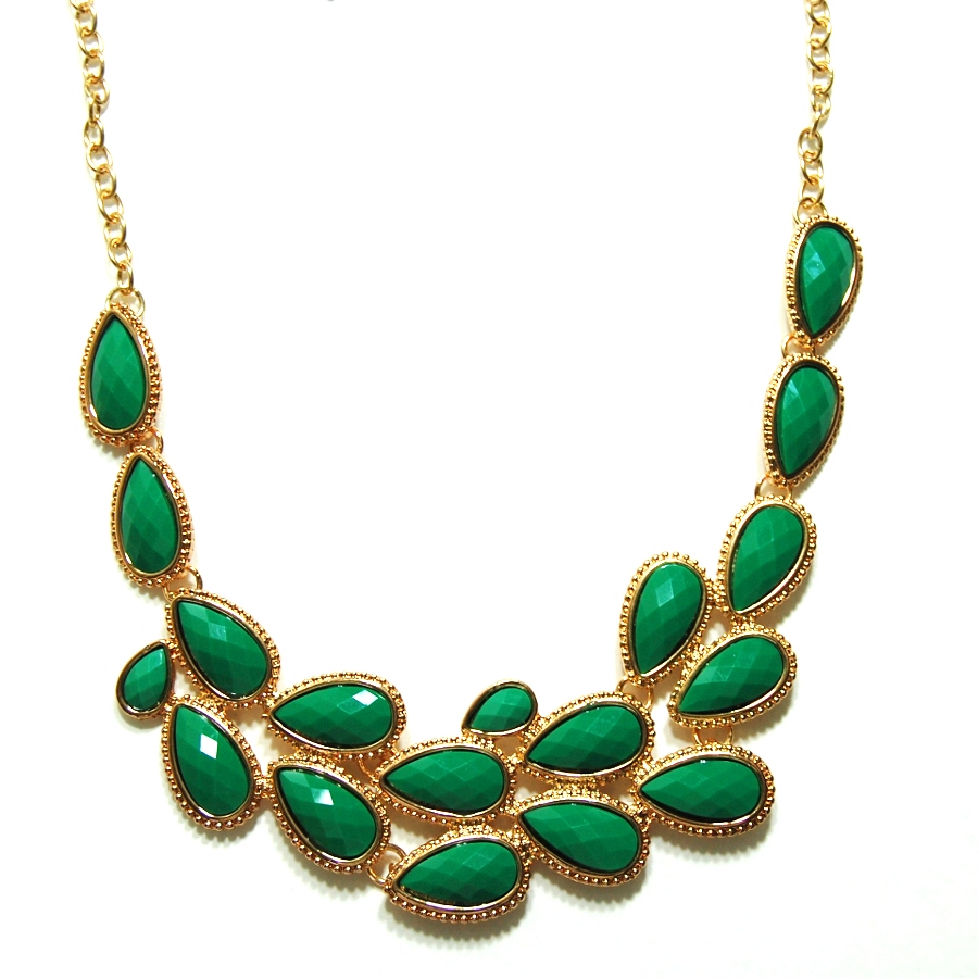 Bold colors to accent the gold bib necklace with teardrop shaped stones.