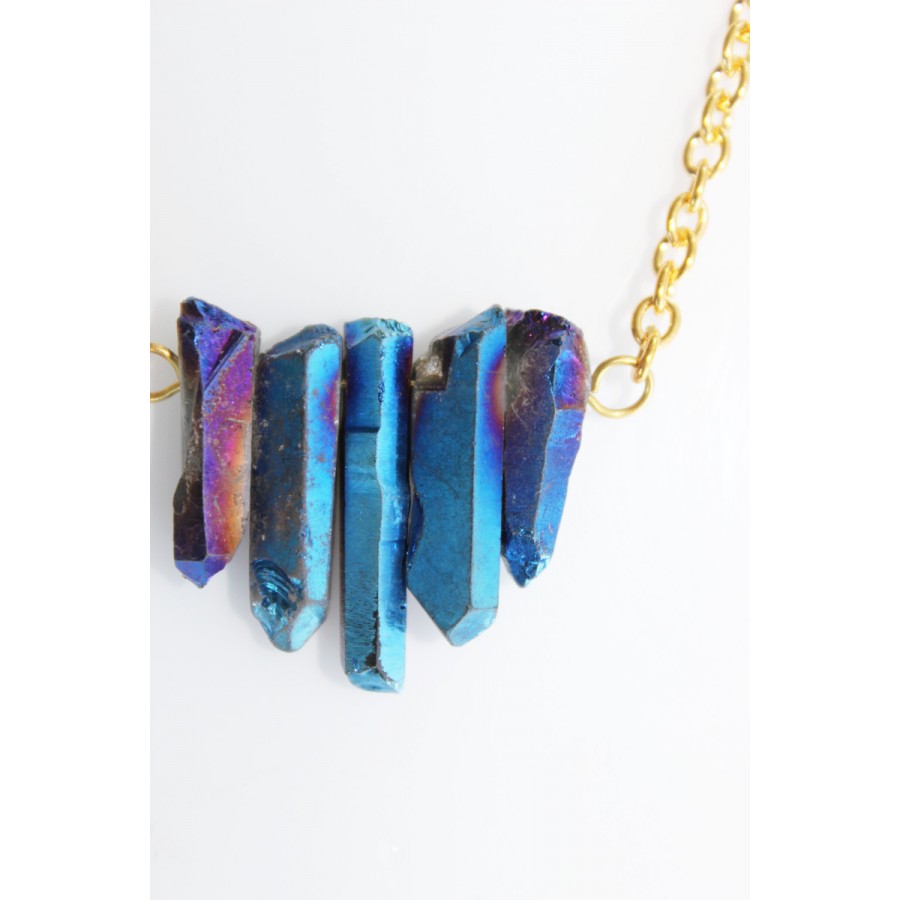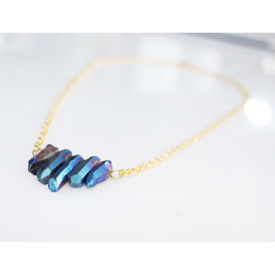 Chakra balancing for the Goddess! Five Gorgeous Rainbow Titanium Quartz Crystals strung from an 18-inch gold-finished chain. Quartz pieces are approximately 1" long. Rainbow Titanium Quartz, also called "Flame Aura" and "rainbow aura quartz”, has been enhanced with a combination of titanium and niobium molecules that are bonded to the quartz by the natural electrostatic charge of the crystal in a process known as magnetron ionization. Themystical rainbow colors are the result of optical interference effects produced by layers of titanium. Since only electricity is used to deposit the titanium layers and create these colors, very little heat is involved and the integrity of the crystal is maintained... The quartz vibrations are filtered through color and transformed to enhance vibrations for each color frequency, providing you with full chakra balancing and positive energy.